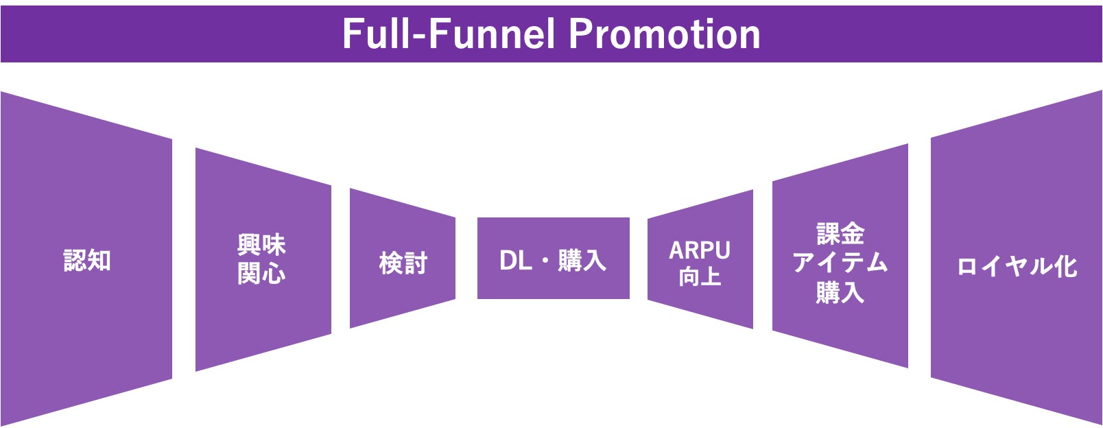 ゲームプロモ―ションの一部に特化した施策ではなく、ユーザーの行動の流れから最適な方法をプランニングし、コンテンツ制作から運営、実行までフルファネルで対応。