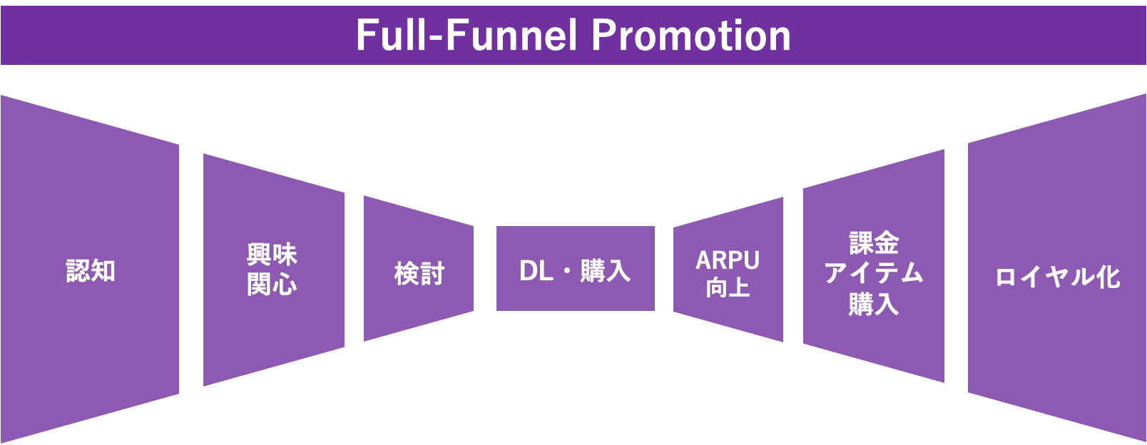 ゲームプロモ―ションの一部に特化した施策ではなく、ユーザーの行動の流れから最適な方法をプランニングし、コンテンツ制作から運営、実行までフルファネルで対応。