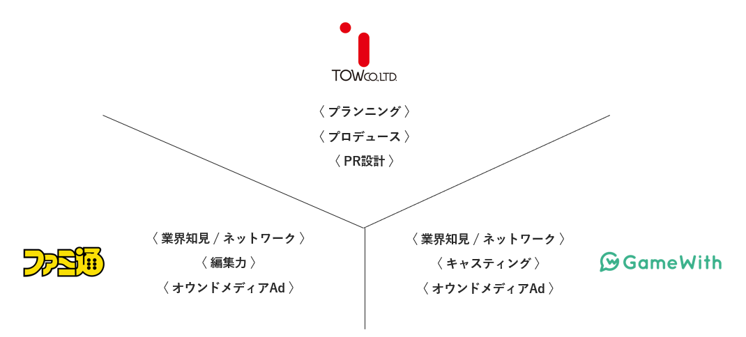 TOWが持提供するフルファネル統合プロデュース&プランニング力と、ゲーム業界で長年培ってきたゲームネットワークやコミュニティを持つ「ファミ通」「GameWith」といったゲームメディアと連携し、ゲームタイトル認知、世界観の訴求、ファン形成および育成などを目的とした情報拡散×プロモーション制作を一手に担います。