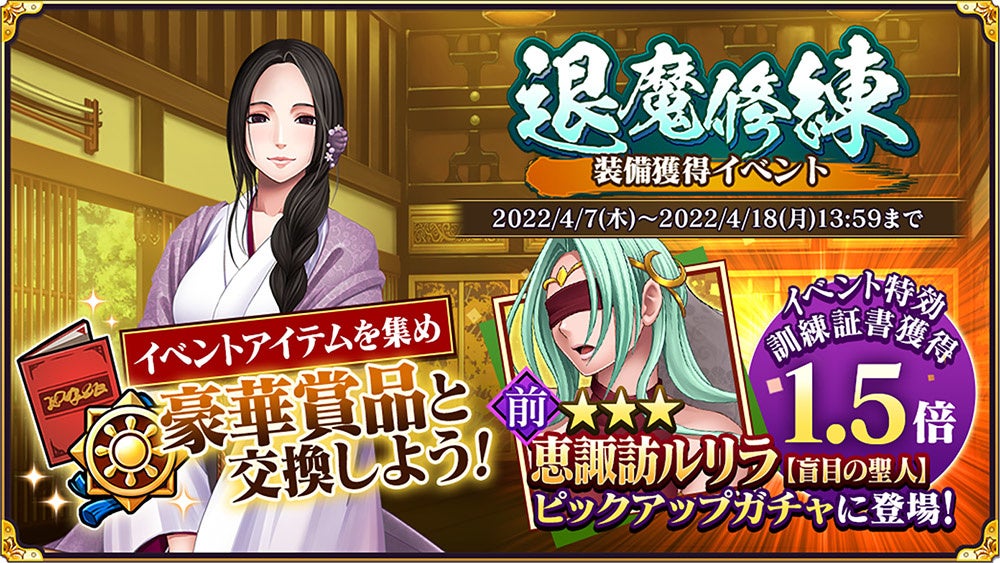 ピックアップガチャでは、新★3退魔士「恵諏訪ルリラ【盲目の聖人】」の出現率がアップ! 彼女を仲間にすると、装備獲得イベント『退魔修練』での訓練証書の獲得量が1.5倍になります!