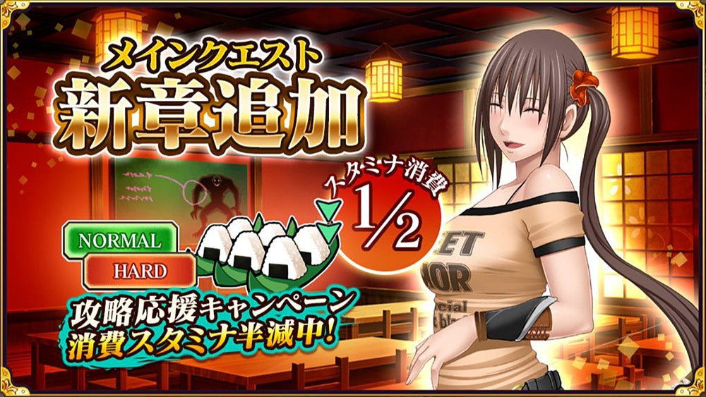 メインクエスト第5章『淫魔始祖の魔の手』が追加されました。退魔系アイドル「南雲さゆき」が登場する、新たなシナリオをお楽しみください! 新章追加に伴い、攻略応援キャンペーンも開催中です。期間中はメインクエストの消費スタミナが半分になります。