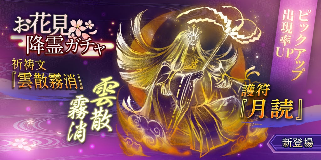 「お花見降霊ガチャ」が登場!期間中、護符『月読(つくよみ)』、祈祷文『雲散霧消(うんさんむしょう)』の出現率がアップします!依頼達成に役立つ護符&祈祷文を手に入れよう!