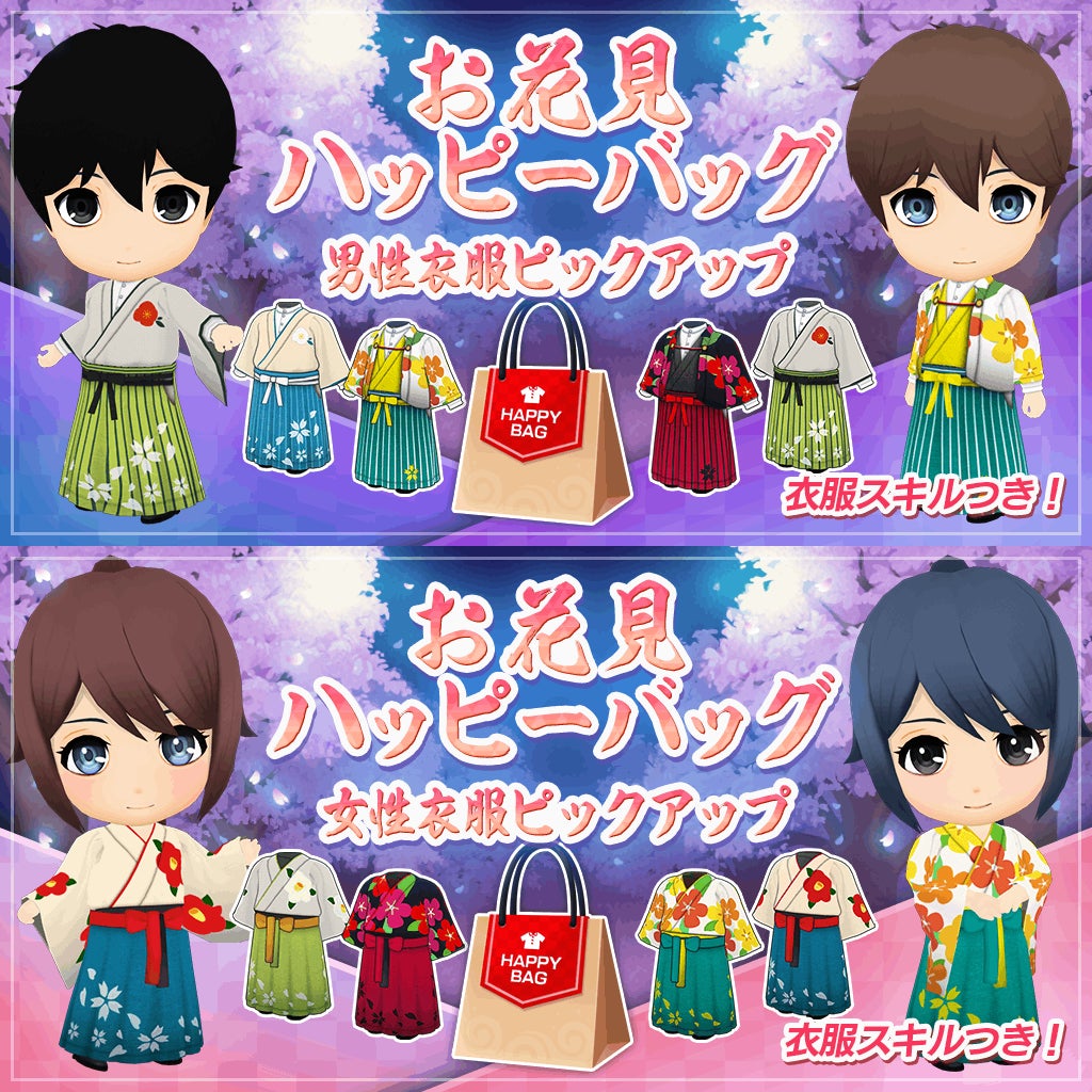 お花見衣装は「お花見ハッピーバッグ・男性衣服ピックアップ」「お花見ハッピーバッグ・女性衣服ピックアップ」で、ピックアップ対象の衣服が異なります。