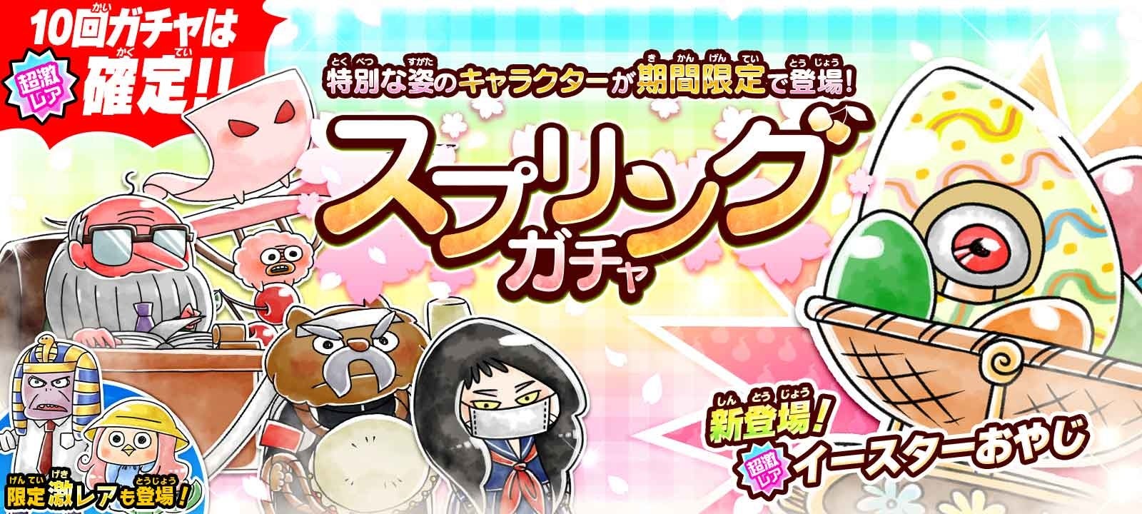 限定超激レア「イースターおやじ」の新登場に加え、今までのスプリングガチャに登場した超激レアが再登場、さらに復刻激レアの出現確率がアップし、10回ガチャは何度でも限定超激レア1体確定の「スプリングガチャ」を開催いたします。