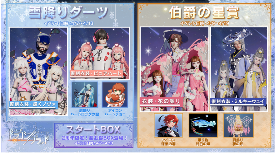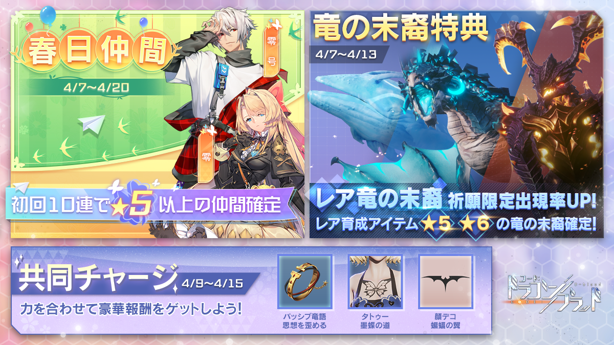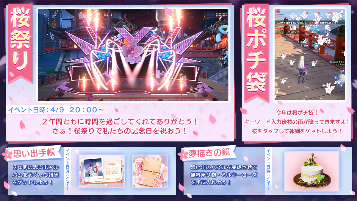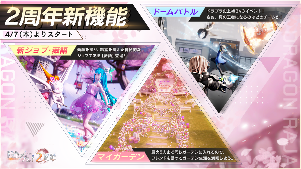 あの頃も今と同じ桜が満開している季節でしたね。この2年間をドラブラと共に過ごしていただき、ありがとうございます! 日頃の皆さまの応援に感謝を込めて、たくさんのイベントや報酬を用意いたしました。さぁ、私たちの記念日を盛大に祝いましょう!