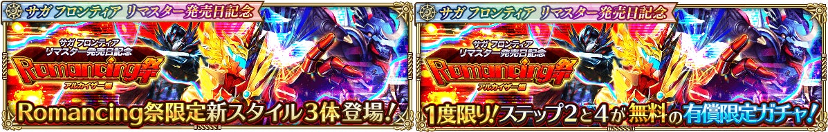 新ガチャ「サガ フロンティア リマスター発売日記念 Romancing祭 アルカイザー編」を開催いたします。