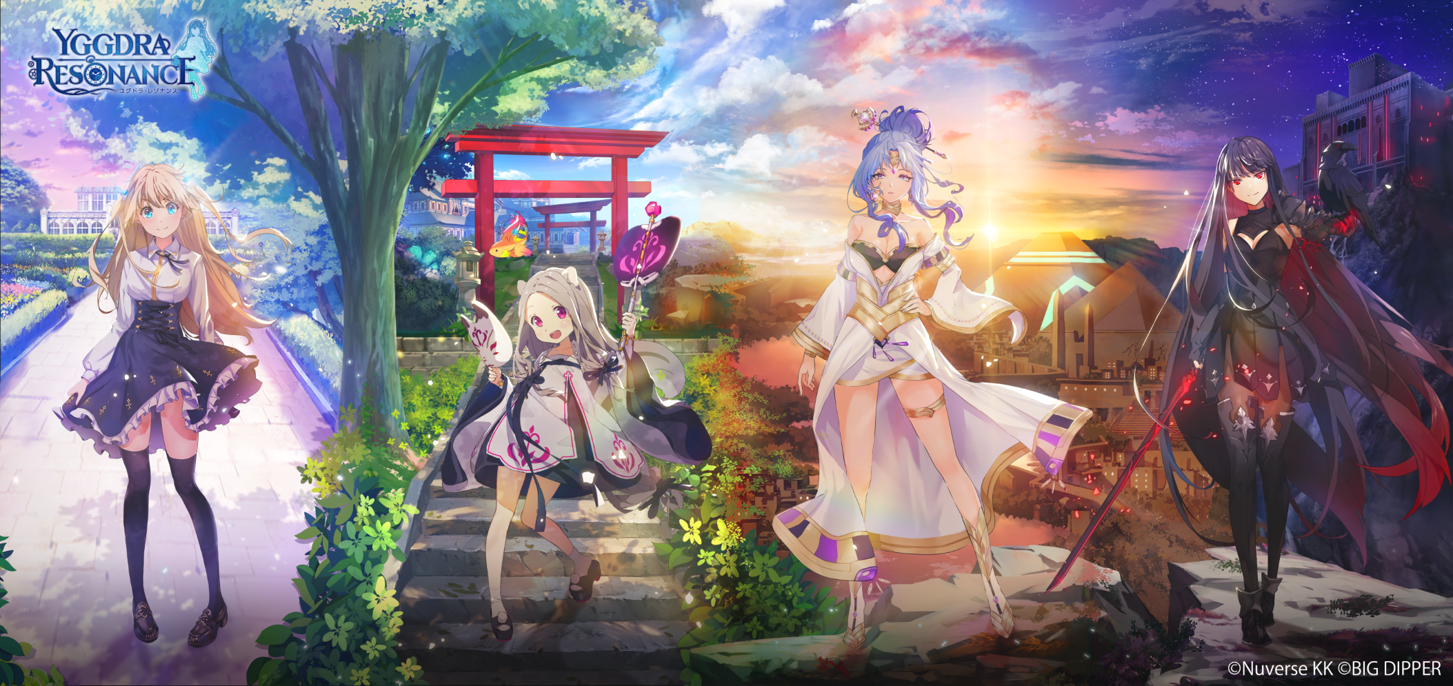 ゲーム内と現実の時間がシンクロするユグレゾのゲームシステムに合わせて制作した新キービジュアルを公開!キービジュアル1枚の中で、“聖ローズマリー学院”の早朝、“旋律の森”の午後、“シャヴィン・ザラ商団”の夕暮れ、“ポール・ヴォスク”の夜というように、一日の各時間帯を、ゲームに登場する陣営の風景とキャラクターで表現しています。ゲーム内も現実世界と同じ時間が流れており、メインページなどで時間の移り変わりを感じていただけます。