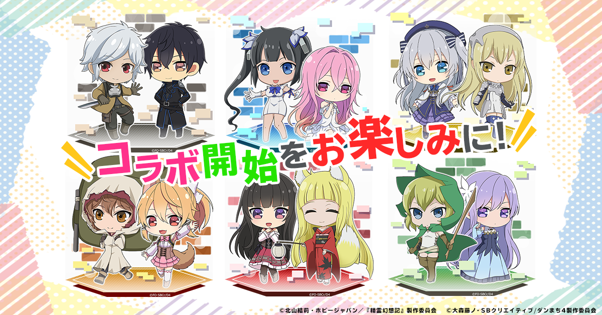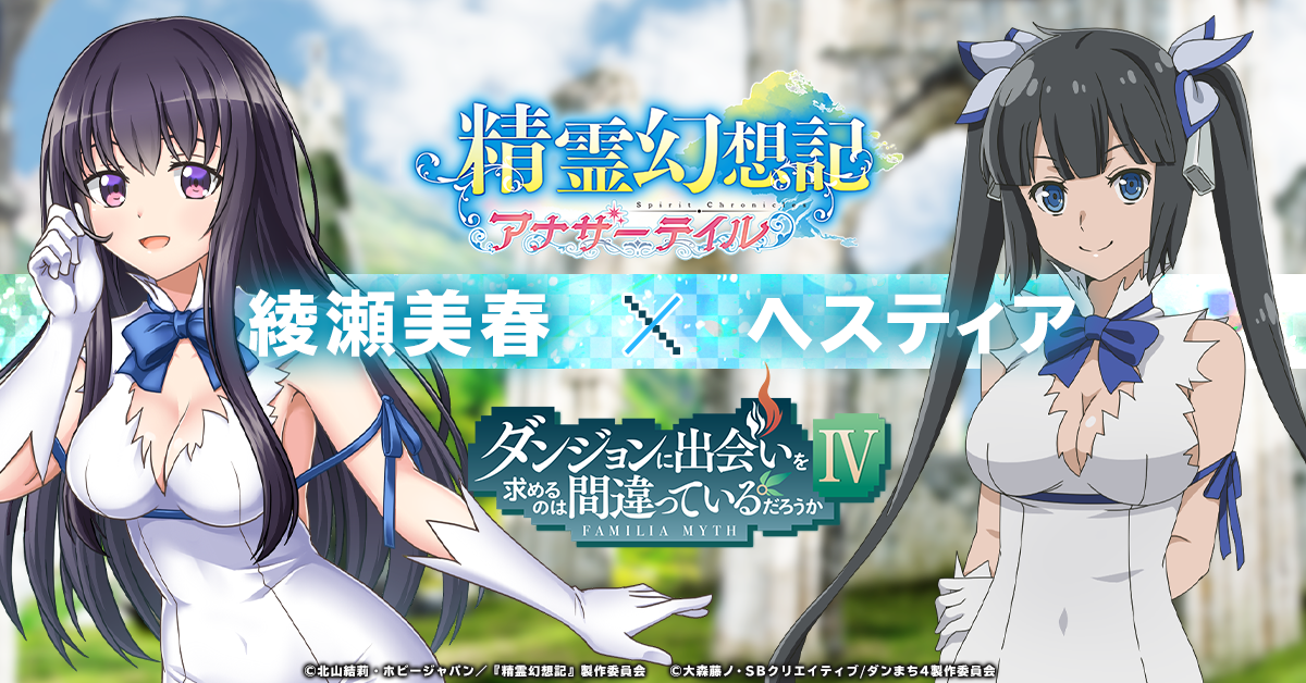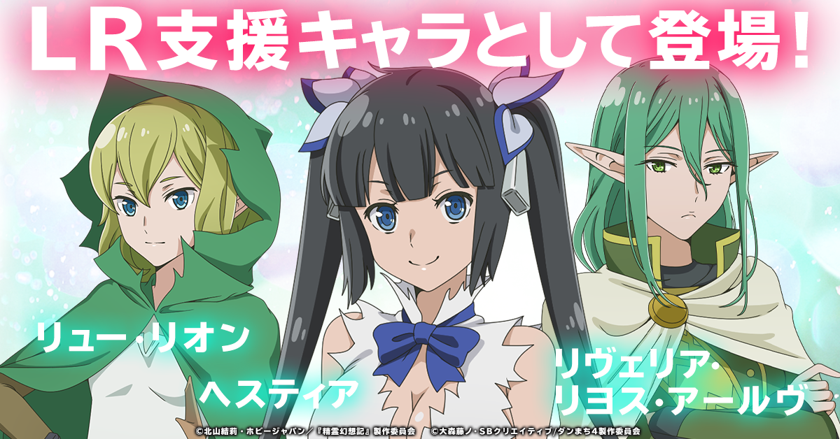 「精霊幻想記」より、「綾瀬美春」「クリスティーナ=ベルトラム」「フローラ=ベルトラム」「リーゼロッテ=クレティア」が、本コラボ限定仕様の仲間キャラスキンとして登場します。さらに、LR支援キャラとして「ダンまち」より、「ヘスティア」「リュー・リオン」「リヴェリア・リヨス・アールヴ」が期間限定で登場します。