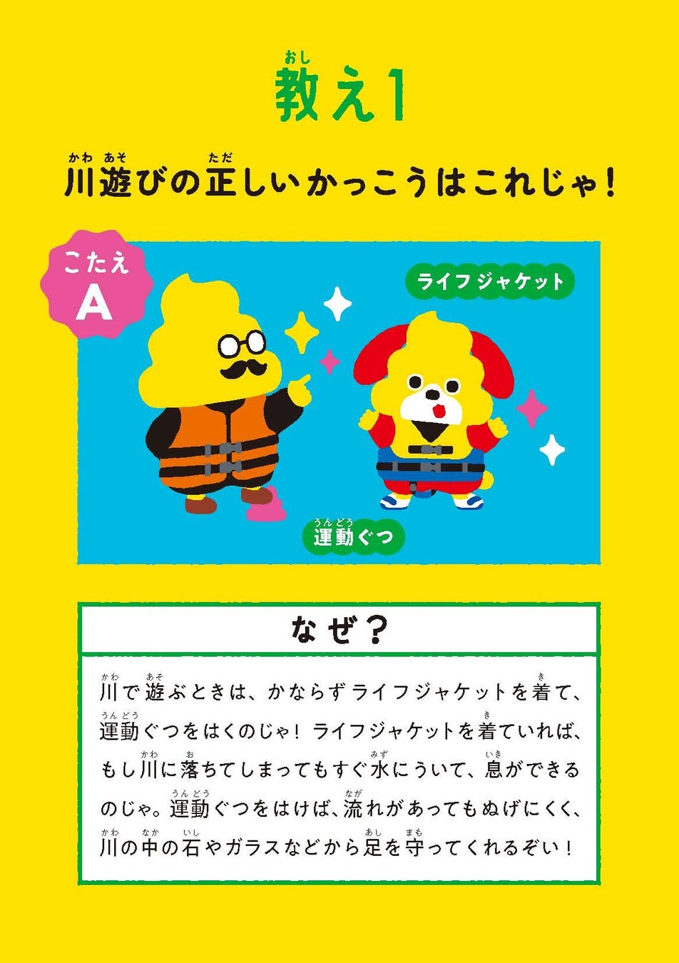 解説では、可愛いイラストとともに川遊びの正しい服装について解説し、その後、問題が5問続きます。