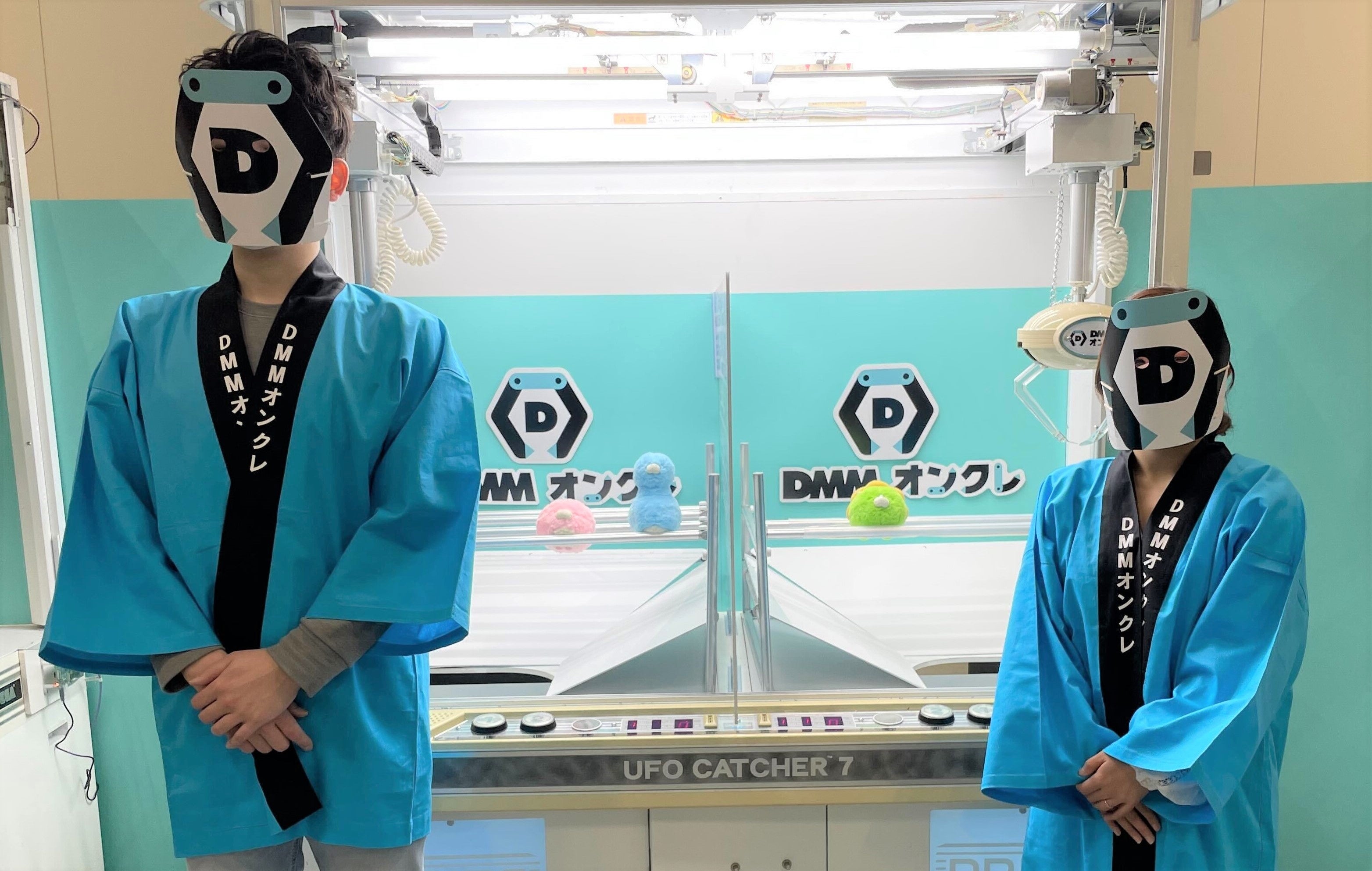 4. 実際にゲームセンターで遊んでいるような演出 「DMMオンクレ」では、ユーザーを楽しませる様々な仕掛けをご用意しています。プレイ中や景品の獲得時 に、専用の法被とロゴのお面を着けたスタッフが、画面越しにユーザーとコミュニケーションをとりゲームを 盛り上げます。また、オリジナルBGMを搭載しプレイ中や待ち時間も楽しめるようにするなど、オンラインでありながら、まるで実際のゲームセンターで遊んでいるかのような演出を盛り込んでいます。