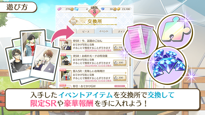 イベントアイテム「おでかけ写真」を手に入れて、イベント限定のSRフォトカードと交換しましょう!