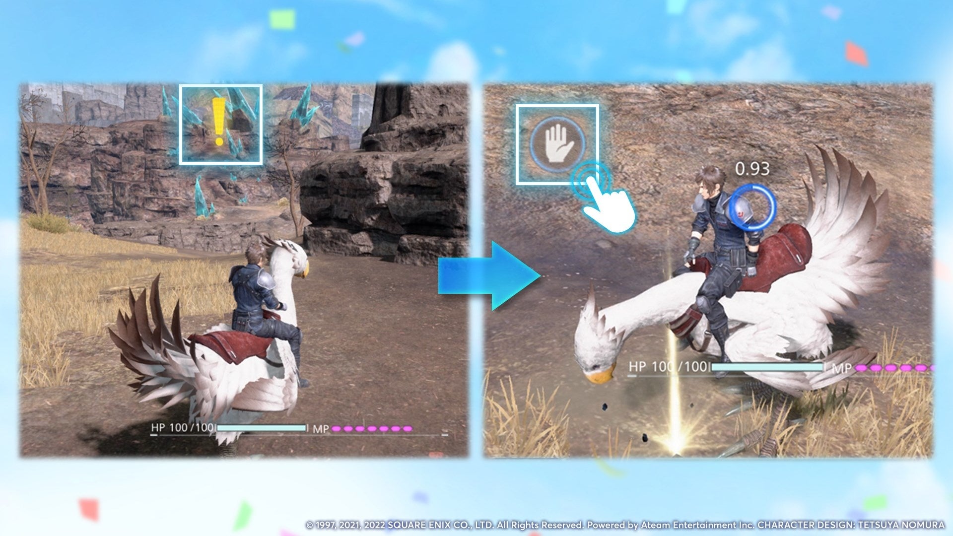 チョコボに乗ってフィールドを走り、採集地点を探してください。採集地点に近づくとチョコボが反応します。