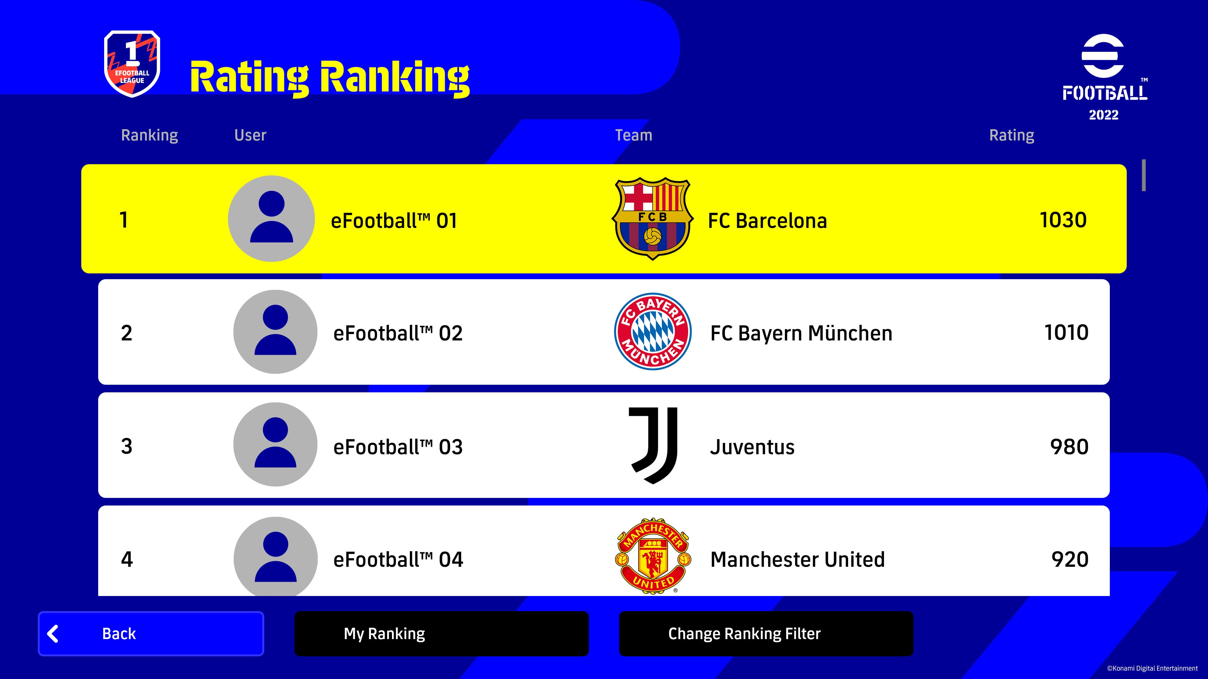 “eFootball”、”e-Football”、”eサッカー”、”e-サッカー”および”eFootballロゴ”は、株式会社コナミデジタルエンタテインメントの日本およびその他の国と地域における登録商標または商標です。