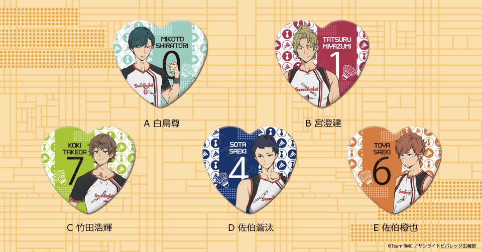キャラクターデザインを使用したハート型缶バッジやアクリルキーホルダー、