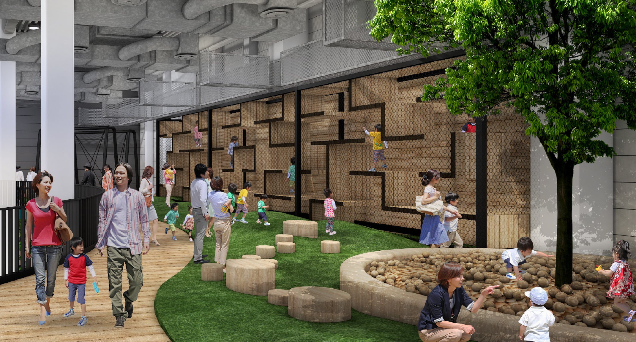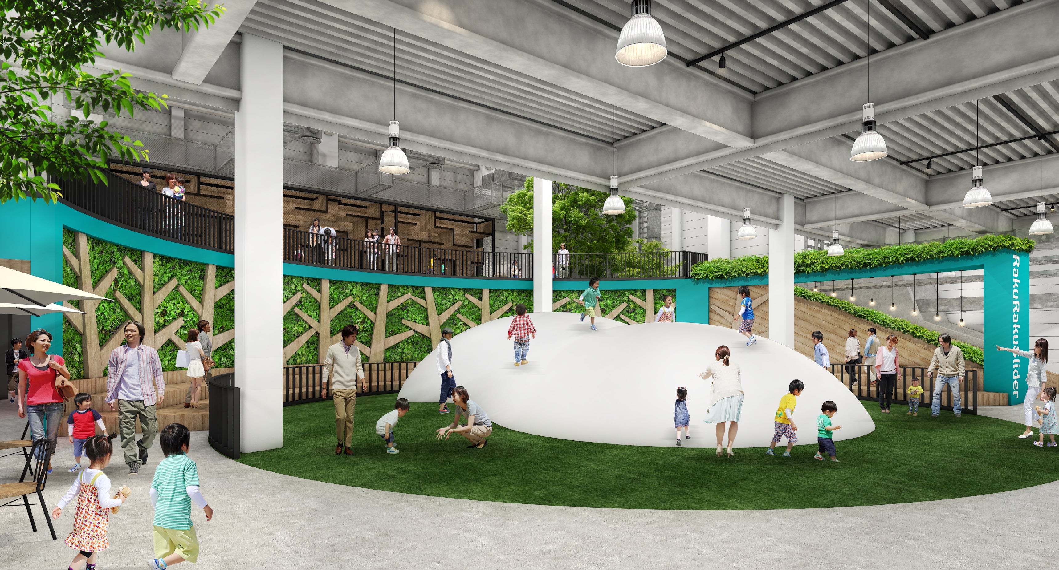 地球環境やエコ、育児支援など社会課題に感度の高い北九州市エリアで共存する新しいアミューズメントパークを提案。発信基地として子どもたちの成長を共に楽しむ施設であり、あそびを通していつの間にか学びの視点が身につくコンテンツ開発に注力していきます。また、家族や友達とゆったりと過ごせるよう、施設内には、木や緑をベースにしたベンチやカフェスペースなどを設け、癒しの空間デザインを施しました。