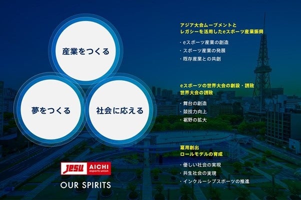 愛知eスポーツ連合は「愛知・名古屋を中心とする地域においてeスポーツを統括し、その普及振興を通して 経済社会の発展に寄与する」ことを目指し、2018年2月に 前身の愛知県eスポーツ協会から名称変更し、一般社団法人 日本eスポーツ連合(JeSU)の地方支部認定をうけました。さらに2019年10月10日に一般社団法人化し、「アジア競技大会2026年愛知・名古屋」の開催をひかえるこの地域において、その種目としての採用が有力な「eスポーツ」とそれをとりまく経済の可能性をお伝えすることで、地域経済発展への寄与を目指してまいります。