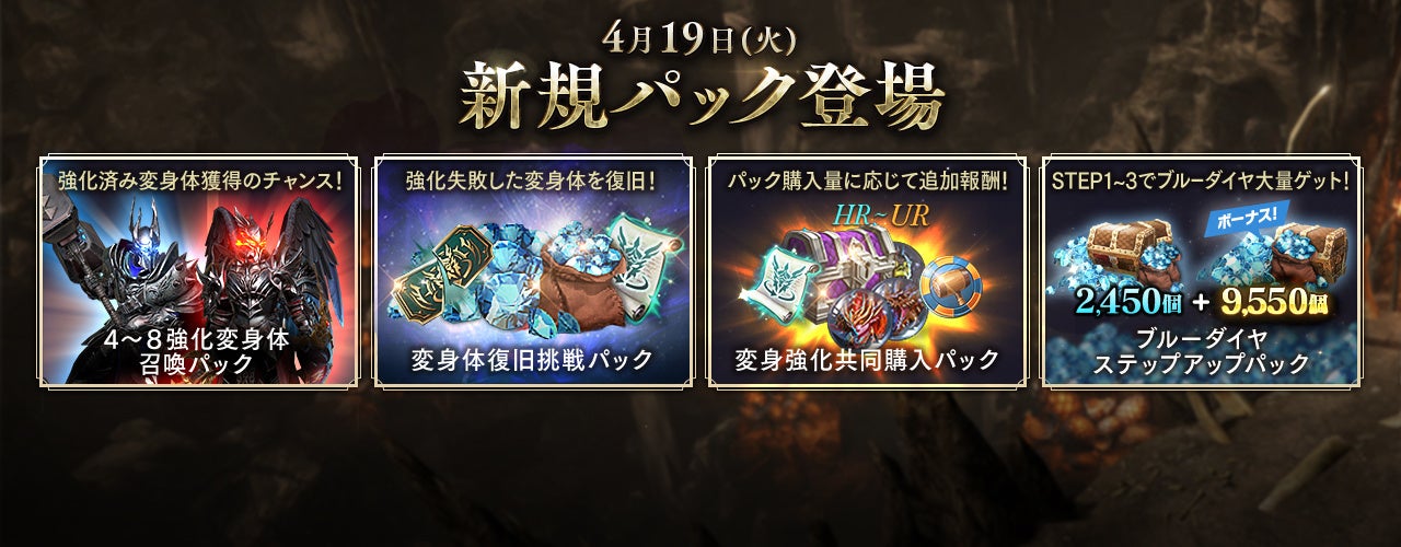 この他、2個集めることで変身体復旧チケットと交換できる「変身体復旧チケットの欠片」を1個獲得できる「変身体復旧挑戦パック」や、強化済み(強化値+4~+8の間)の変身体をランダムで獲得できる「4~8強化変身体召喚パック」、変身体や変身体強化スクロールが獲得できる「変身強化共同購入パック」(共同購入目標値が一定以上に達すると追加で変身体強化スクロールを獲得できる)など、本アップデートに関連した新商品が多数登場しております。
