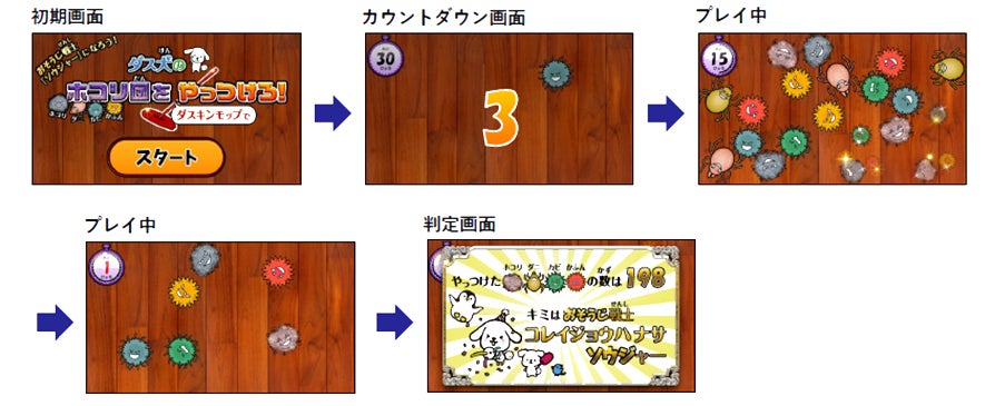 2022年3月に「おそうじ館」に新しく導入したアトラクション「ダス犬(だすけん)のほこり団をやっつけろ!」は、プロジェクションインタラクティブマット※2の技術を使い、床面に映し出される「ホコリ団(ホコリ・ダニ・カビ・カフン)」をダスキンモップを使って30秒間でいくつ消せるかを競うゲームです。消した数に応じて与えられる「称号」は7通り。中には激レアの「称号」もあり、盛り上がる仕組みになっています。参加費は無料で、開館時間中いつでもプレイできます。