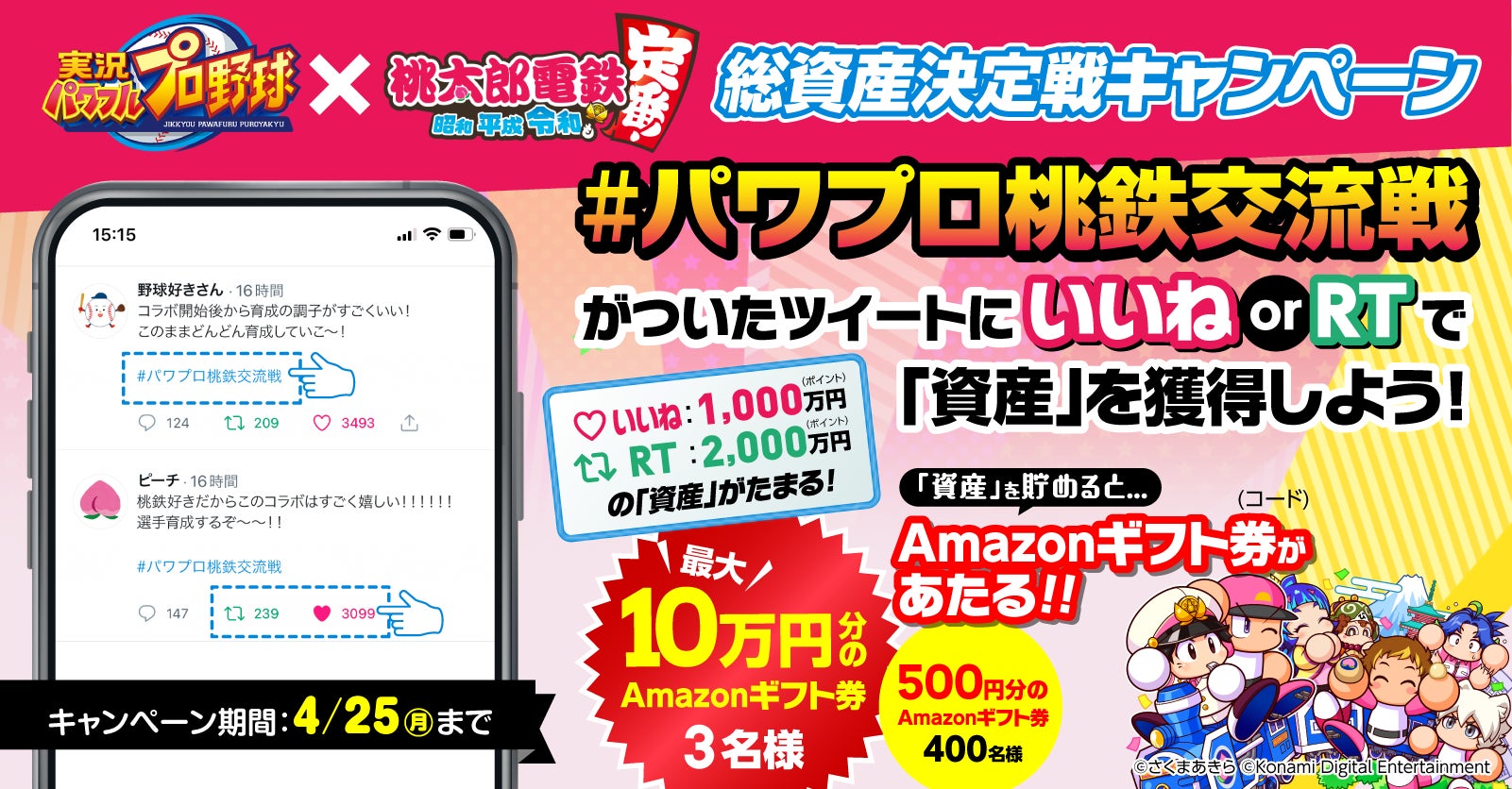 Twitterにて、「パワプロ・桃鉄交流戦 総資産決定戦キャンペーン」を開催します!「#パワプロ桃鉄交流戦」のついた投稿を「いいね」または「リツイート」して、資産を貯めましょう!