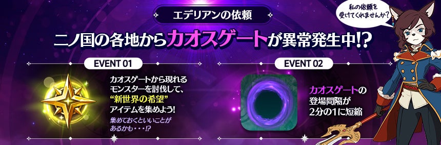 ネットマーブルは、レベルファイブとタッグを組みスマートフォン向けに開発したファンタジーアートRPG『二ノ国:Cross Worlds』(略称:ニノクロ)において、本日4月21日(木)のアップデートより、次回アップデート時に様々な報酬を手に入れられるアイテムを獲得できる新イベントを開催することをお知らせいたします。