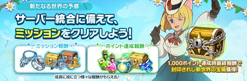 各種ボス・魔物の討伐や育成ダンジョンクリアなどのミッションを達成してポイントを集めてください。各ミッションのクリア報酬に加え、集めたポイントは次回アップデート時に様々な報酬を獲得できる「封印されし新世界の宝箱」などのアイテムと交換できます。