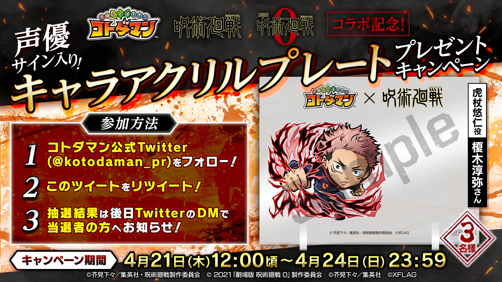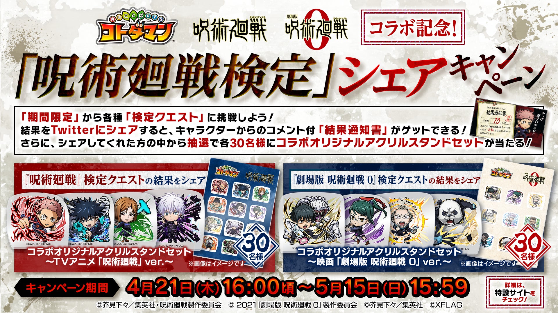 コラボイベントの開催に合わせて、新たなキャンペーンも開始します。TVアニメ『呪術廻戦』『劇場版 呪術廻戦 0』のクイズが出題されるクエスト「呪術廻戦検定」の結果をTwitterでシェアすると、本コラボ描き下ろしのイラストを使用した「コラボオリジナルアクリルスタンドセット」が当たります。また、コトダマン公式アカウントから投稿されるキャンペーン対象ツイートをリツイートすると、抽選で各声優のサイン入り「キャラアクリルプレート」をプレゼントするキャンペーンを実施します。