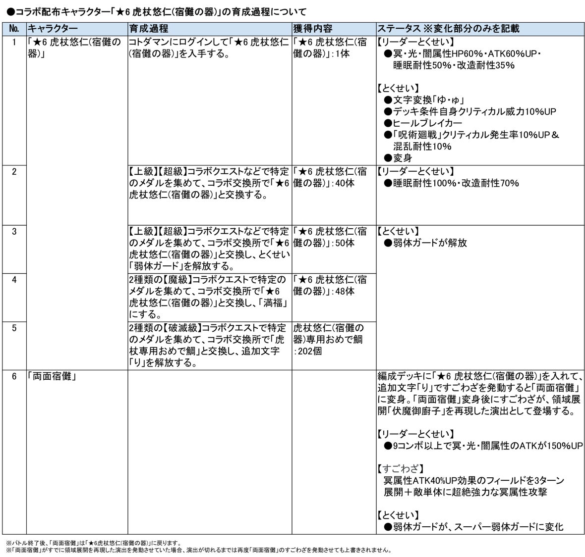 コラボ配布キャラクター「★6 虎杖悠仁(宿儺の器)」は、コラボイベントを通じて強化され、一定状態まで育成し、バトル中に特定条件を満たすと「両面宿儺」に変身します。さらに、「両面宿儺」変身時のすごわざでは“領域展開”を再現した演出も登場します。