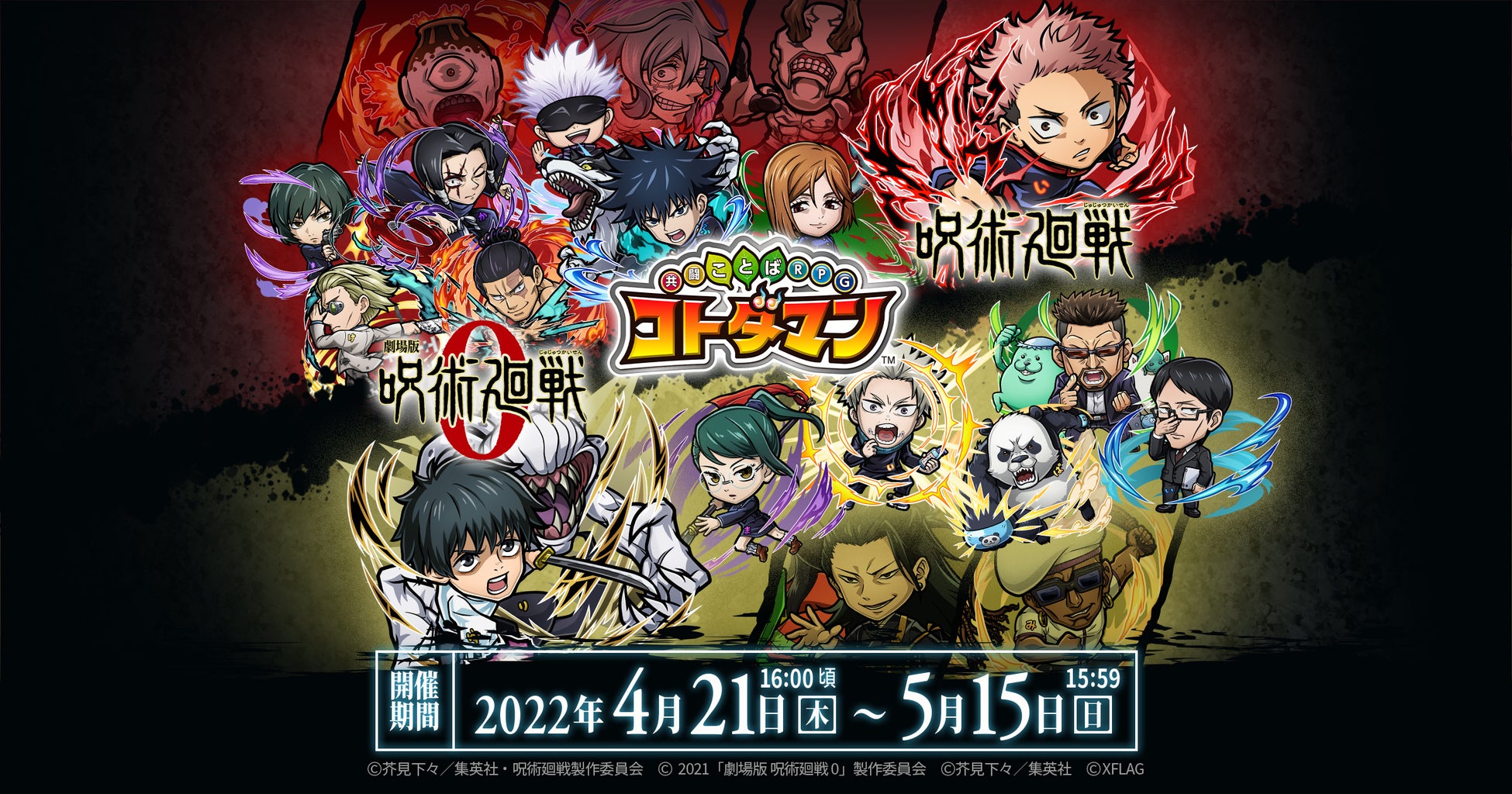 株式会社ミクシィ(東京都渋谷区、代表取締役社長:木村 弘毅)が展開するエンターテインメント事業ブランド「XFLAG (エックスフラッグ)」は、スマホアプリの「ことば」で闘う新感覚RPG「共闘ことばRPG コトダマン」(以下、コトダマン)において、TVアニメ『呪術廻戦』『劇場版 呪術廻戦 0』とのコラボレーションを本日、2022年4月21日(木)より開催します。