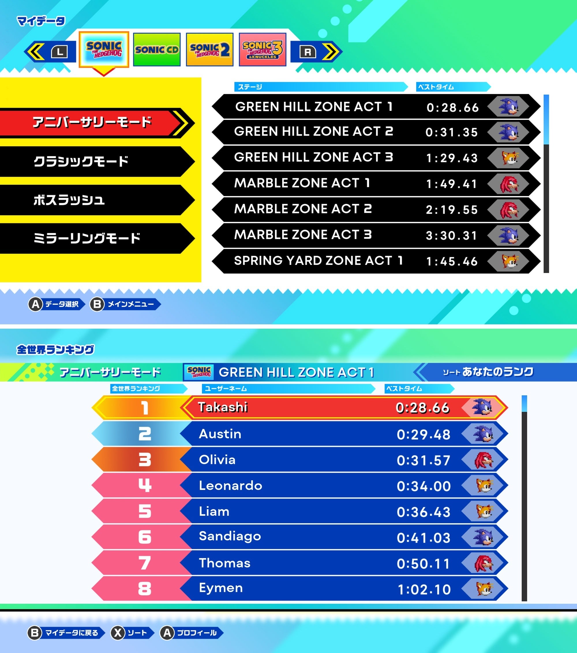 「アニバーサリーモード」では、16:9の大画面でゲームが楽しめるだけでなく、タイムオーバーとコンティニューがなくなったことで、ゲームオーバーを気にせずソニックのスピードを楽しむことができるようになりました。