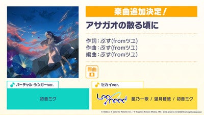 株式会社セガ(本社:東京都品川区、代表取締役社長COO:杉野行雄)と株式会社Colorful Palette(本社:東京都渋谷区、代表取締役社長:近藤裕一郎)は、iOS/Android向けリズム&アドベンチャー『プロジェクトセカイ カラフルステージ! feat. 初音ミク(以下、プロジェクトセカイ)』について、新たな書き下ろし楽曲提供クリエイターとして、ユリイ・カノン(月詠み)さん、キタニタツヤさん・はるまきごはんさんの参加など、新情報を多数発表いたしました。