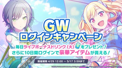 2022年4月29日(金)より、「GWログインキャンペーン」を開催いたします。キャンペーン期間中にログインした方には、毎日「ライブボーナスドリンク(大)」をプレゼントいたします。