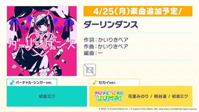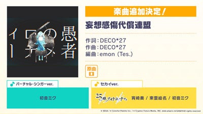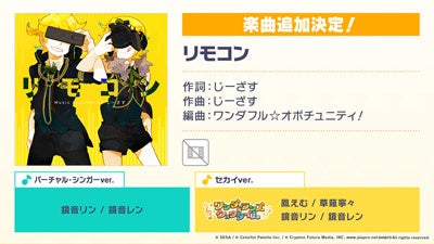 新たなリズムゲーム楽曲として、「ダーリンダンス」(作詞・作曲:かいりきベア)、「妄想感傷代償連盟」(作詞・作曲:DECO*27)、「リモコン」(作詞・作曲:じーざす)、「アサガオの散る頃に」(作詞・作曲:ぷす(fromツユ))の追加が決定いたしました。