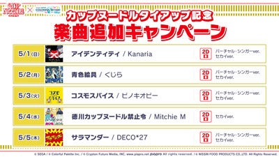 「カップヌードルタイアップ記念楽曲追加キャンペーン」として、2022年5月1日(日)より5日間連続でカップヌードルタイアップの全5曲をリズムゲーム楽曲としてゲーム内に追加いたします。