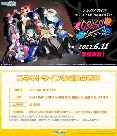 本公演は、Vivid BAD SQUADのメンバーとバーチャル・シンガーから初音ミク、鏡音レン、巡音ルカ、KAITOが出演し、MC+全曲フルサイズでお届けするバーチャルライブで、公演時間は約1時間を予定しております。なお、公演は6月11日(土)に3回の開催を予定しています。