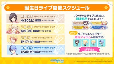東雲絵名、天馬咲希、天馬司、青柳冬弥の誕生日を記念して、バーチャルライブの開催が決定いたしました。また、バーチャルショップにてフルセット「なりきり衣装」を販売予定です。