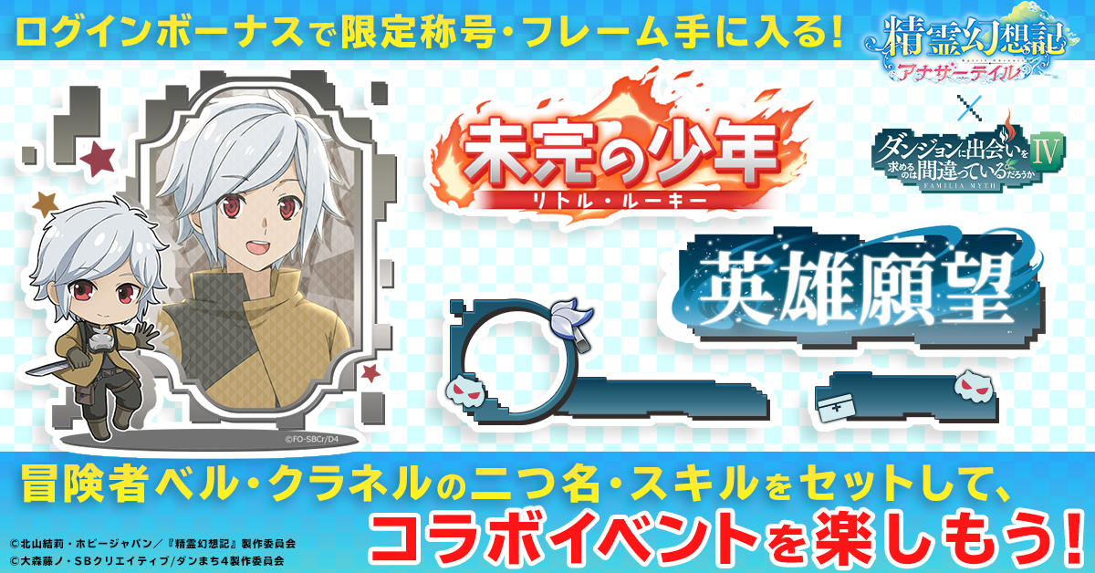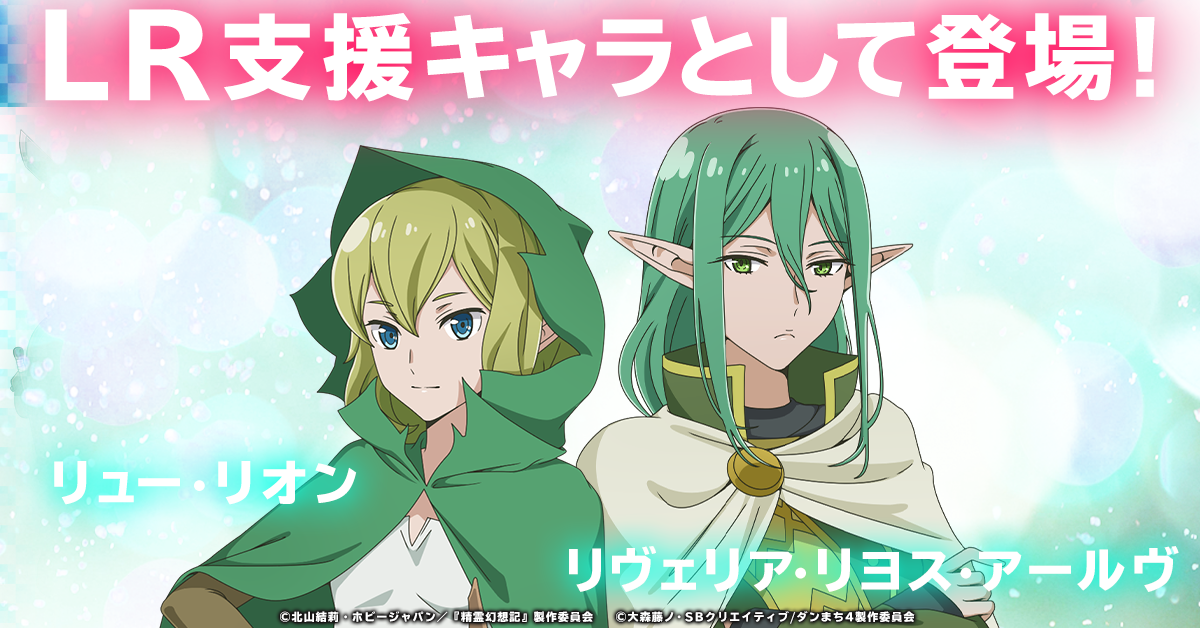 「精霊幻想記」より、「綾瀬美春」「クリスティーナ=ベルトラム」「フローラ=ベルトラム」「リーゼロッテ=クレティア」が、本コラボ限定仕様の仲間キャラスキンとして登場します。さらに、LR支援キャラとして「ダンまち」より、「リュー・リオン」「リヴェリア・リヨス・アールヴ」が期間限定で登場します。