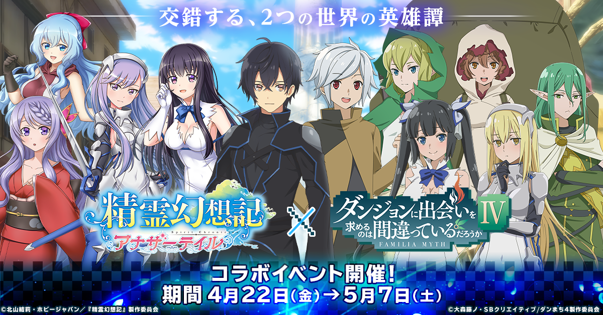 CTW株式会社は、「G123」にて配信中のHTML5ゲーム『精霊幻想記アナザーテイル』(以下、アナテイ)にてアニメ「ダンジョンに出会いを求めるのは間違っているだろうかⅣ」とのコラボイベントの開催をお知らせいたします。