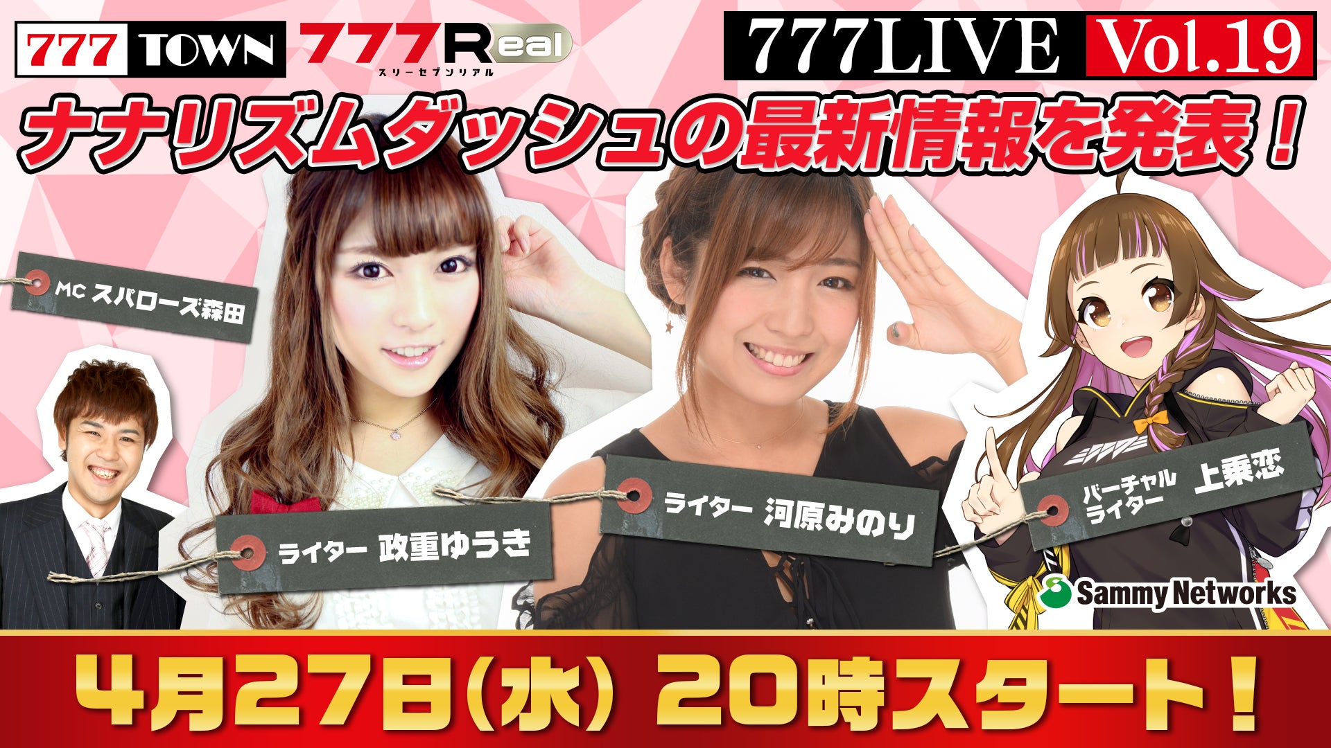 株式会社サミーネットワークスは、ぱちんこ・パチスロがパソコン、スマホで打てる「777TOWN(スリーセブンタウン)」、無料で遊んで豪華景品がもらえるスマホ向けサービス「777Real(スリーセブンリアル)」の生放送を、2022年4月27日(水)20時から配信いたします。