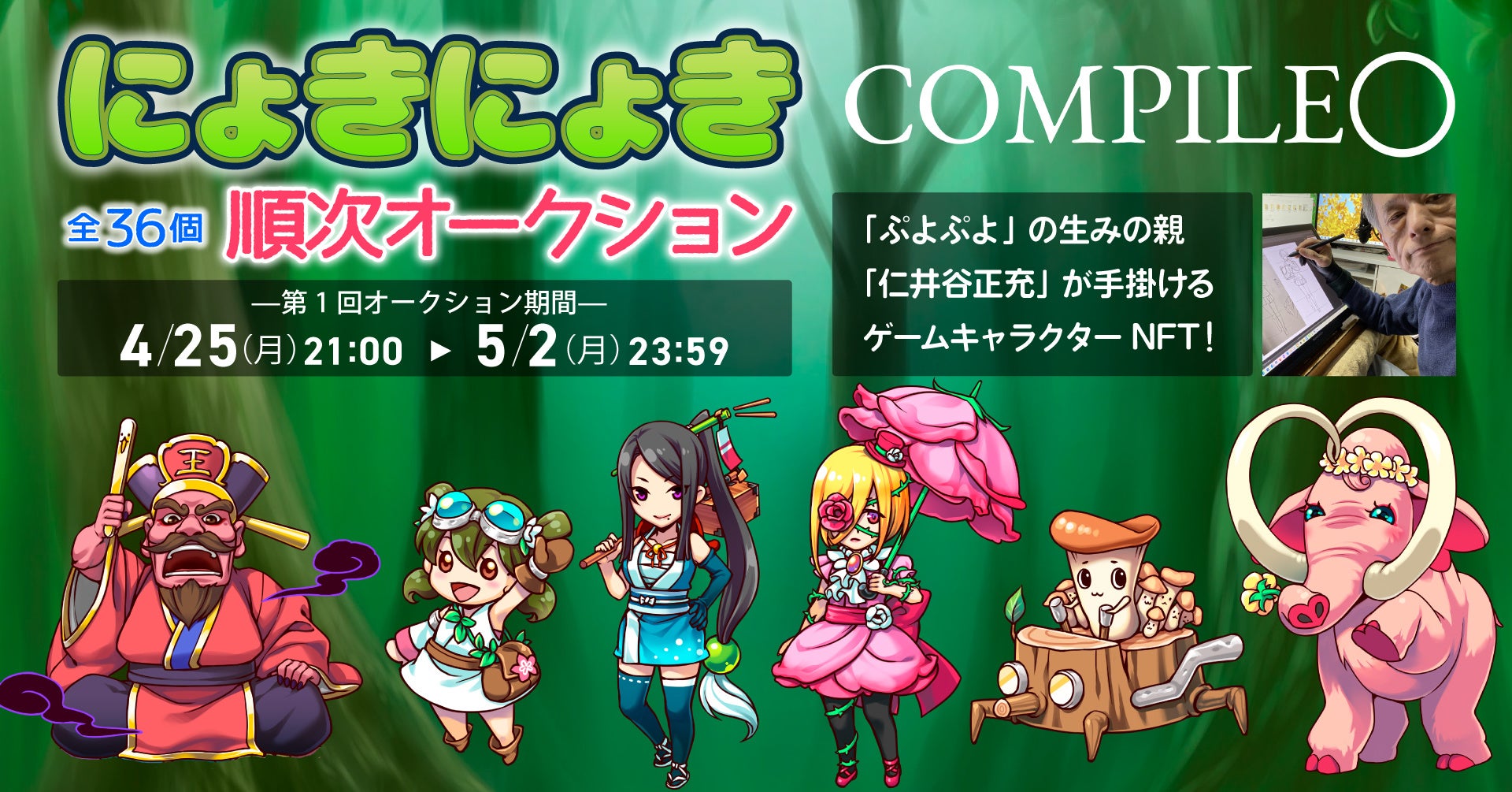 有名落ちものゲーム「ぷよぷよ」の生みの親である仁井谷正充氏が手掛けるゲーム「にょきにょき」シリーズ第一弾の全キャラクター6体(マリーロゼシア、沢川はるか、閻魔大王、ジョセフィーヌ、マザーエリンギ、琴やよい)の6パターン(基本大、普通、勝ち、焦り、喜び、負け)の計36個のNFTを全7回のオークションで販売します。
