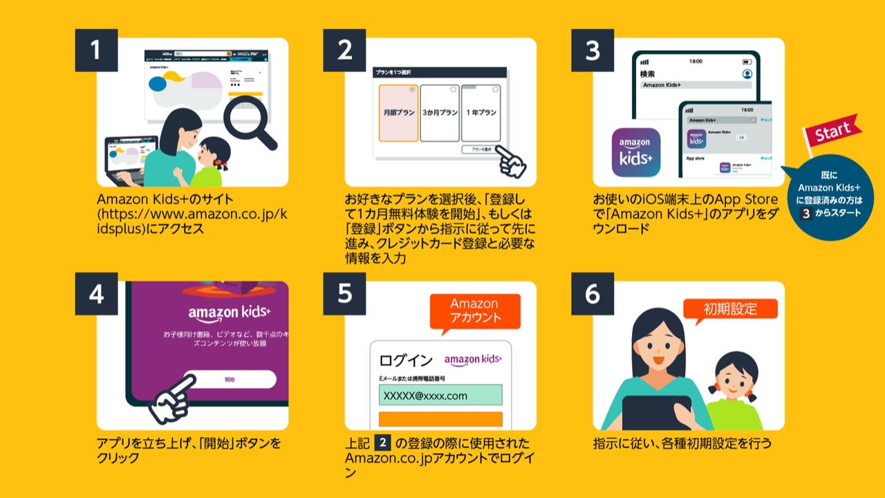 上記イラストに沿った、Amazon Kids+のiOSアプリ利用手順: