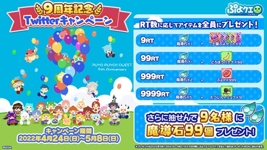 株式会社セガは、大好評配信中のパズルRPG『ぷよぷよ!!クエスト』(以下、「ぷよクエ」)が、2022年4月24日に9周年を迎えたことをお知らせします。「ぷよクエ」では、最大で240万個の「魔導石」が獲得できるキャンペーンや、「ぷよクエ9周年記念チケット」99枚のプレゼントに加え、「ぷよクエ9周年記念 1日1回クエスト」を開催! また、4月24日に配信した生放送を記念したログインボーナスも配布。豪華イベントを楽しんで、「ぷよクエ」の9周年を一緒にお祝いしましょう。