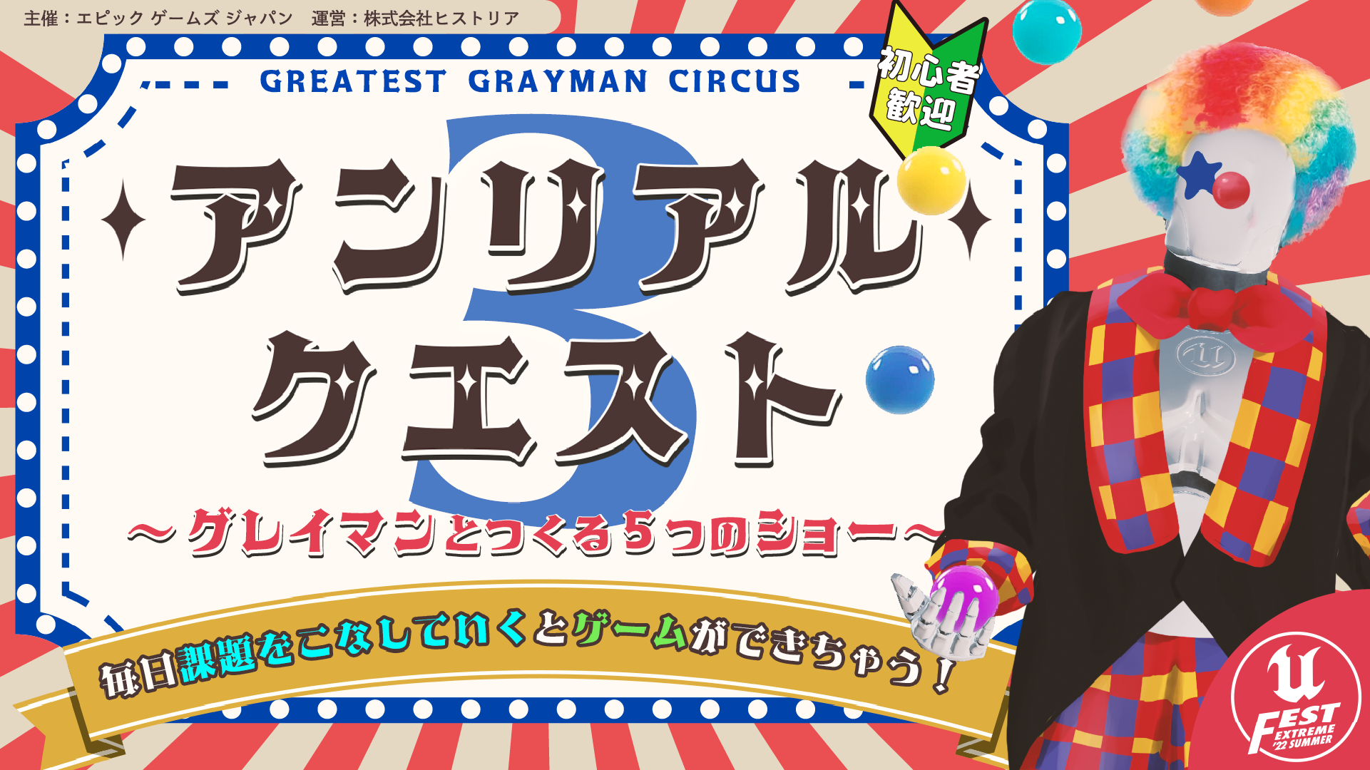 UE初心者やUNREAL FEST初参加という方に向けて「UNREAL FEST EXTREME 2022 SUMMER」 の歩き方・楽しみ方や「アンリアルクエスト3 ~グレイマンとつくる5つのショー~」の参加方法についてご紹介する生配信を4月27日(水) 20時より行います。ぜひ、リアルタイムでご視聴いただきUNREAL FESTに備えましょう!