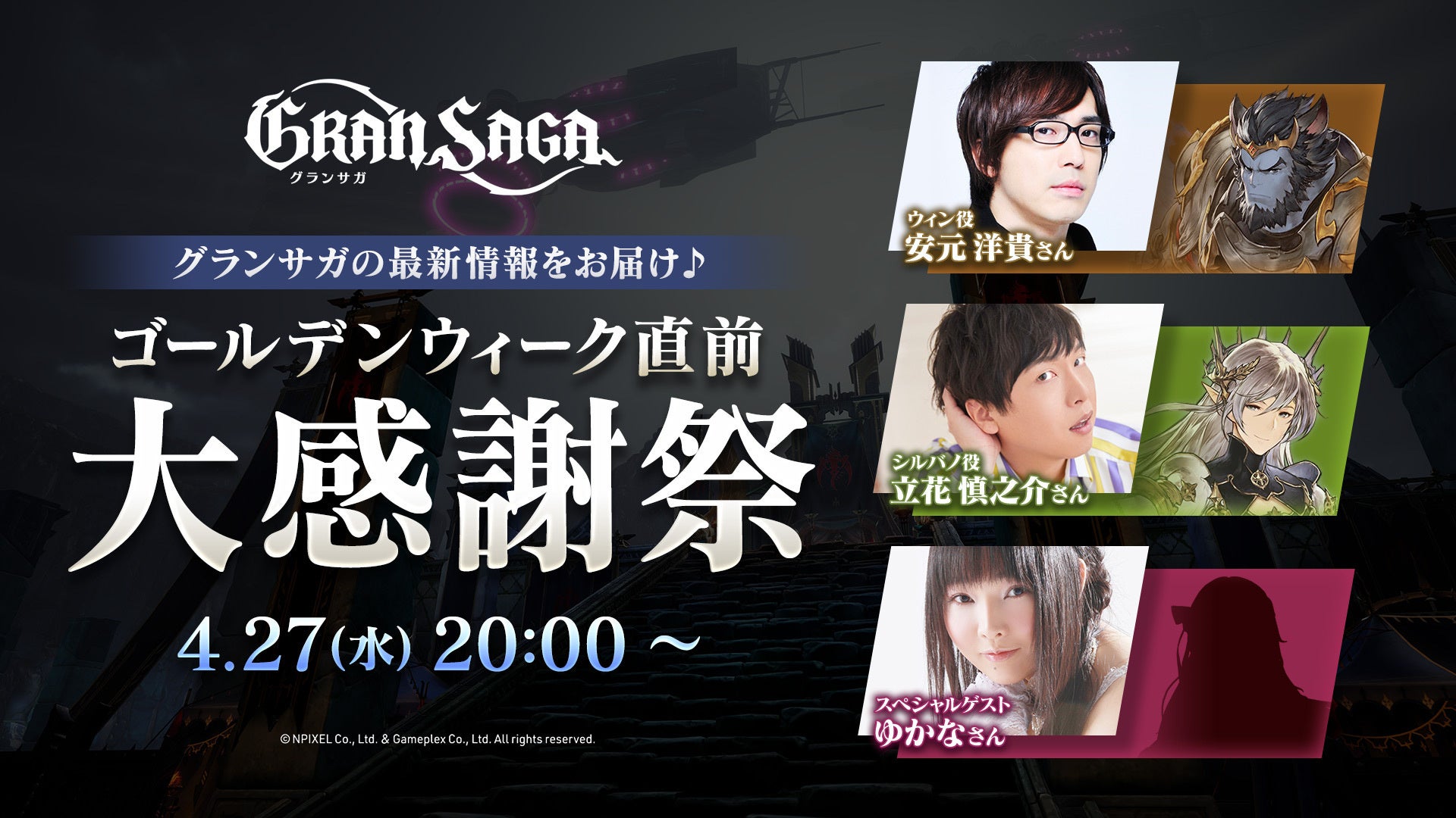 グランサガの最新情報をいち早くお届けする、グランサガ公式番組「グランサガチャンネル」のゴールデンウィーク直前特番、「ゴールデンウィーク直前 大感謝祭 スペシャル番組」を、4月27日(水)20時より配信することが決定いたしました!
