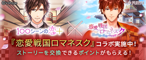 株式会社ボルテージ(本社:東京都渋谷区 代表取締役:津谷 祐司)は、提供中のボル恋タイトル「100シーンの恋+」 (以下、「100恋+」)がフリュー株式会社(本社:東京都渋谷区、代表取締役社長:三嶋 隆)の運営する恋愛シミュレーションゲーム「恋愛戦国ロマネスク~影武者姫は運命をあやなす~」(以下、「恋愛戦国ロマネスク」)との期間限定コラボキャンペーンを、4月26日(火)より実施することをお知らせいたします。