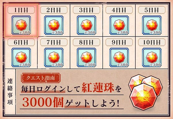 期間中、毎日ログインすると最大で紅蓮珠(無償)3,000個をプレゼントいたします。