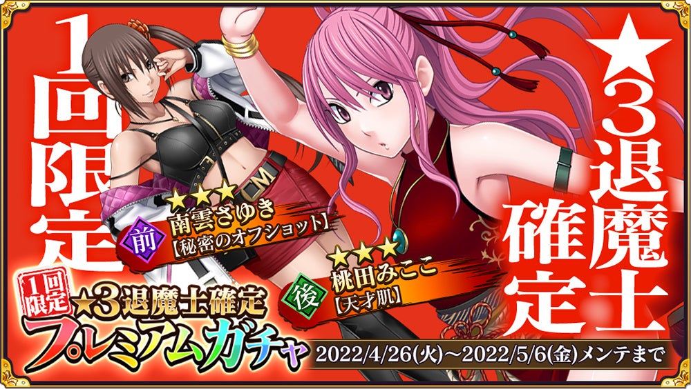 期間限定で1人1回限定の★3退魔士確定プレミアムガチャを開催中です。10連目で必ず★3退魔士が獲得できます!さらに新★3退魔士「桃田みここ【天才肌】」と★3退魔士「南雲さゆき【秘密のオフショット】」の出現率UP!
