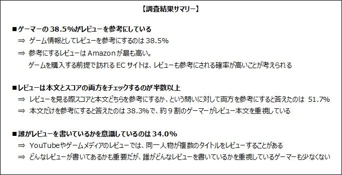 ゲームのレビューは長文になりがちで、読み込むのには時間もかかりますが、9割近くのゲーマーはレビュー本文をじっくりチェックし購入するゲームを選んでいるようです。またゲームレビュー自体を1つのコンテンツとして楽しんでいる姿も浮かび上がってきます。