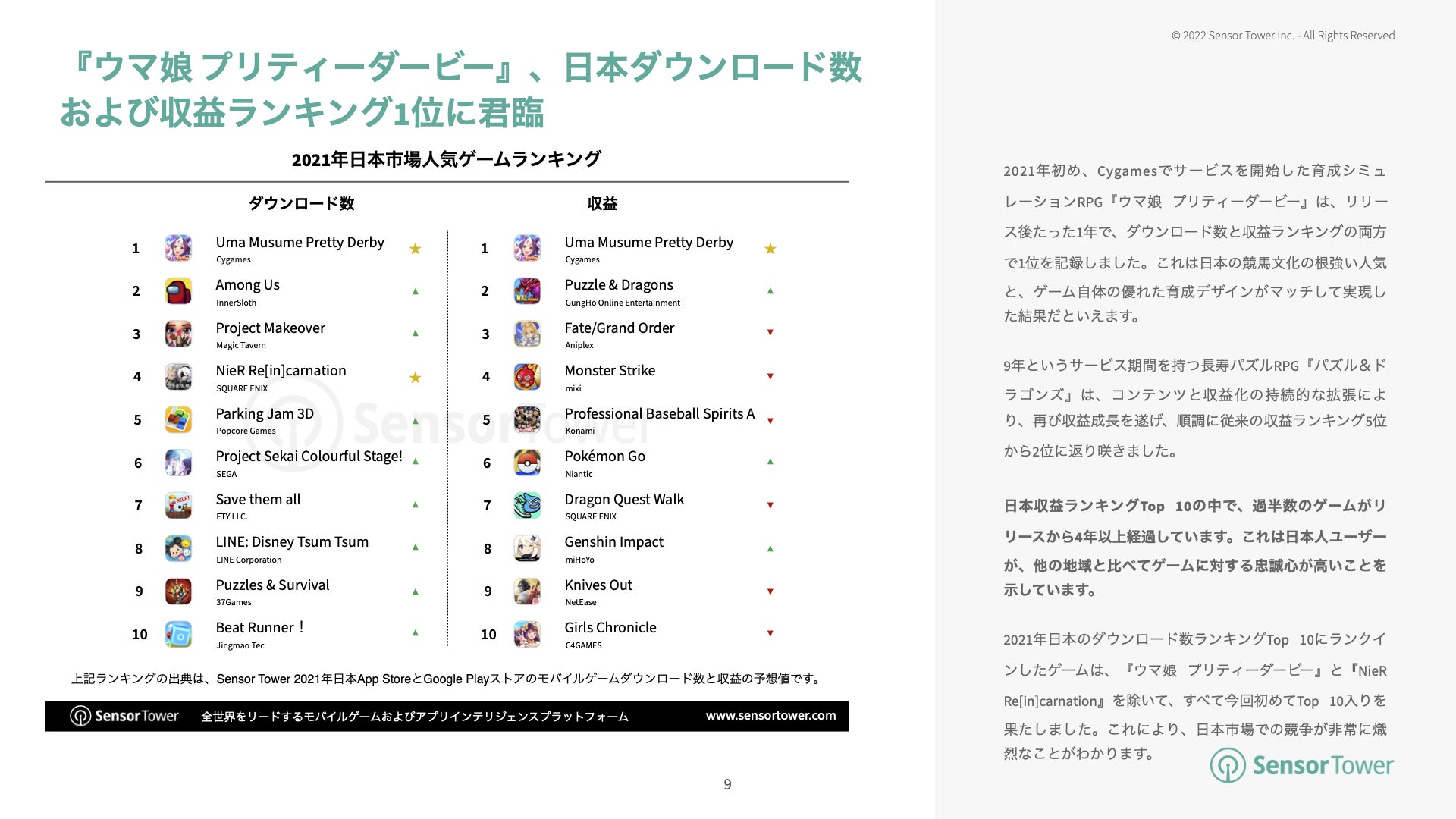 2021年日本ダウンロード数ランキングTop 10にランクインしたゲームは、『ウマ娘 プリティーダービー』と『NieR Re[in]carnation』を除いて、すべて今回初めてTop 10入りを果たしました。これにより、日本市場での競争が非常に熾烈なことがわかります。
