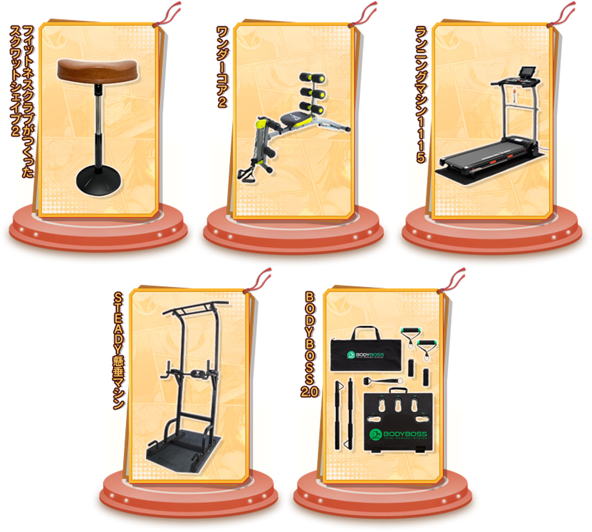 └➀フィットネスクラブがつくったスクワットシェイプ2、➁ワンダーコア2、➂ ランニングマシン115、④STEADY懸垂マシン、⑤BODYBOSS2.0