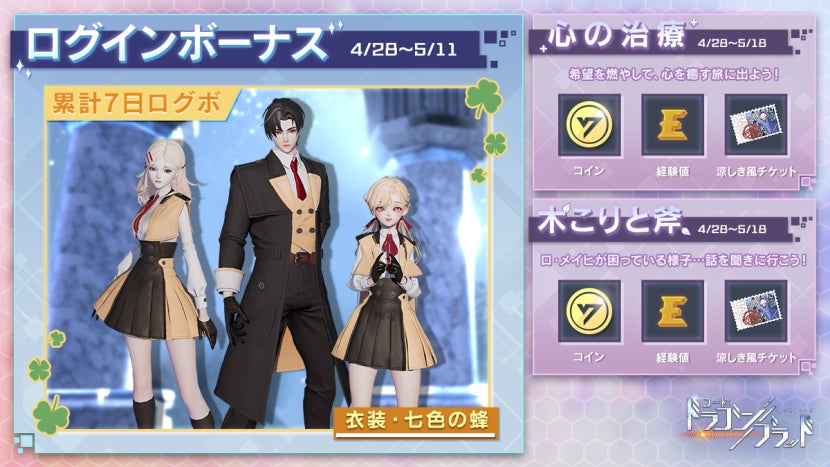 さらに、4月28日~5月11日の期間内に、ログインして「七色の蜂の交換欠片」を7枚集めれば、「衣装・七色の蜂」と交換できます。ぜひ、この機会を見逃がしなく、無料衣装をゲットしましょう!